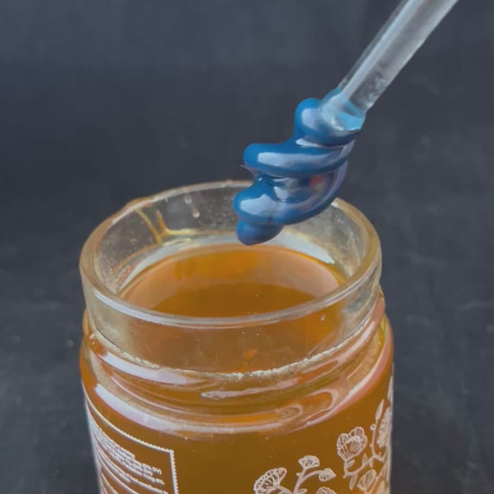 Scoop up your honey with this adorable Honey Dipper, featuring a small bear topper! Hand sculpted from borosilicate glass, this unique dipper will make your tea time a little more playful and sweet. Buzz-worthy addition to any kitchen!