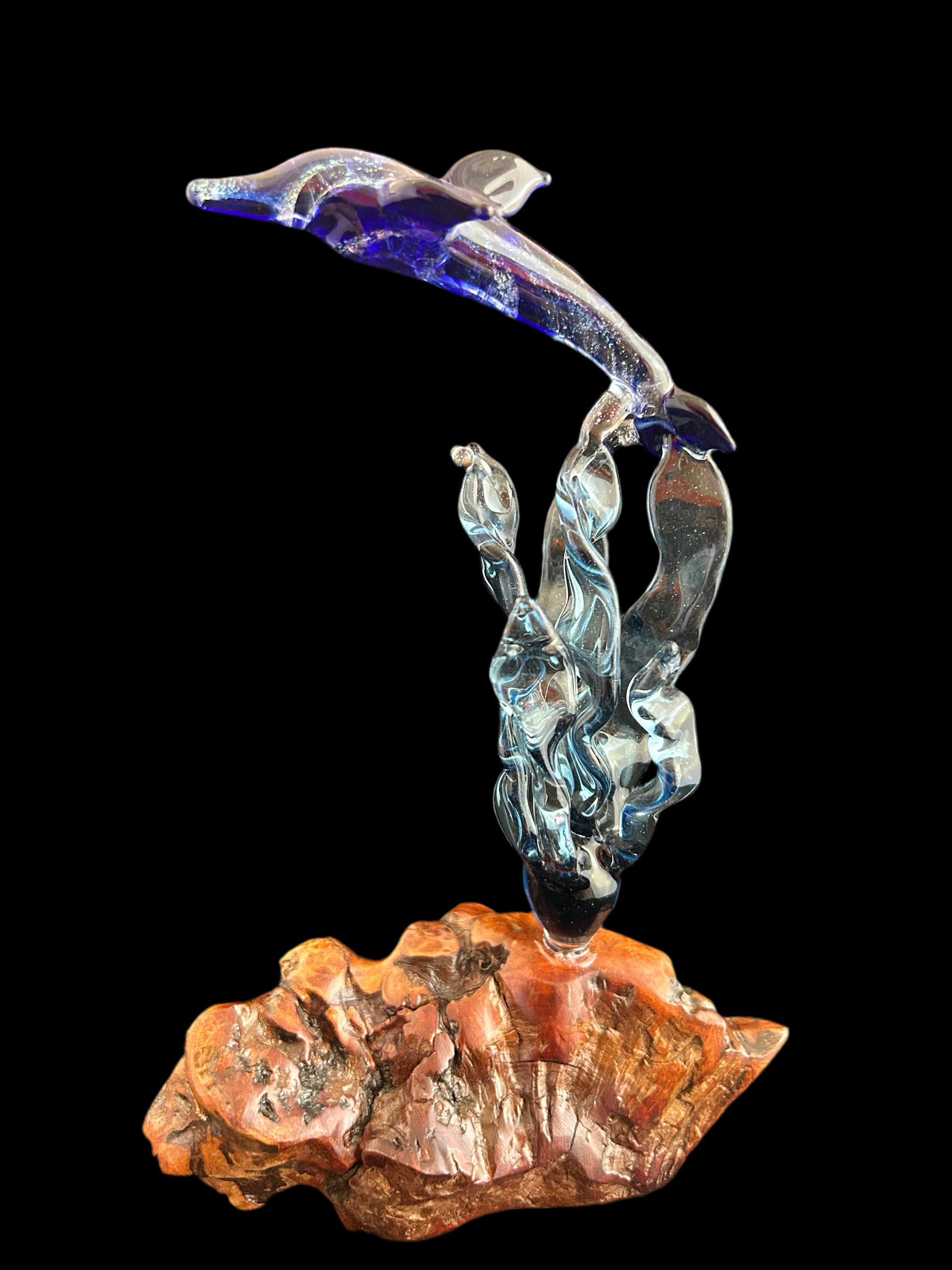 Made with exquisite hand sculpted bore silicate glass, this Cobalt Blue Dolphin #1 is a true masterpiece. Mounted on a luxurious Manzanita wood base, the brilliant splash of water represents the boundless freedom of the ocean. Display it in your home for a touch of elegance and an alluring reminder of the sea.