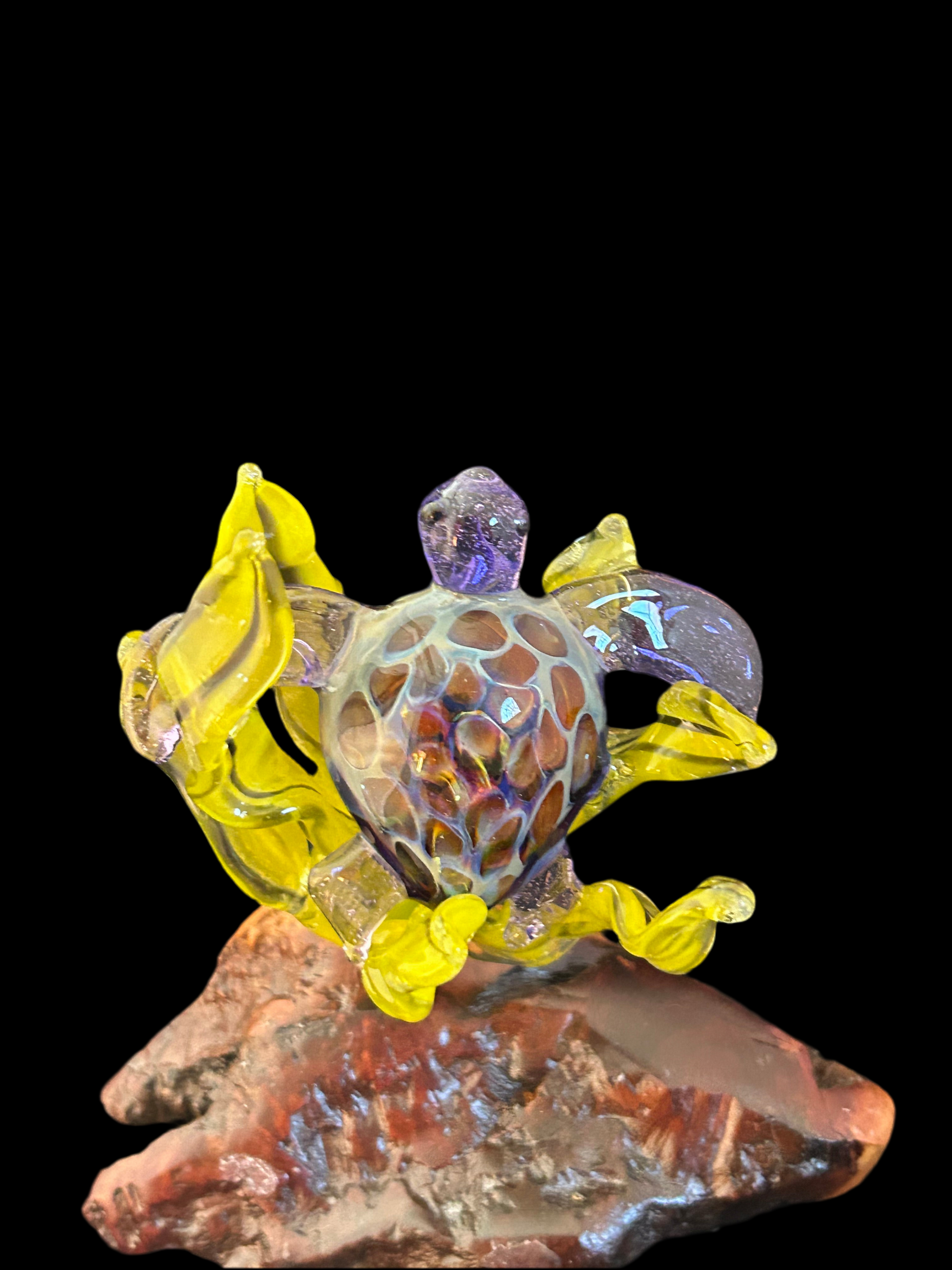 Elevate your decor with our Purple Turtle Sculpture. Meticulously hand-crafted with borosilicate glass, the honeycomb body and seaweed details evoke a sense of luxury and style. Mounted on a manzanita base, this exclusive piece will add sophistication and elegance to any space.
