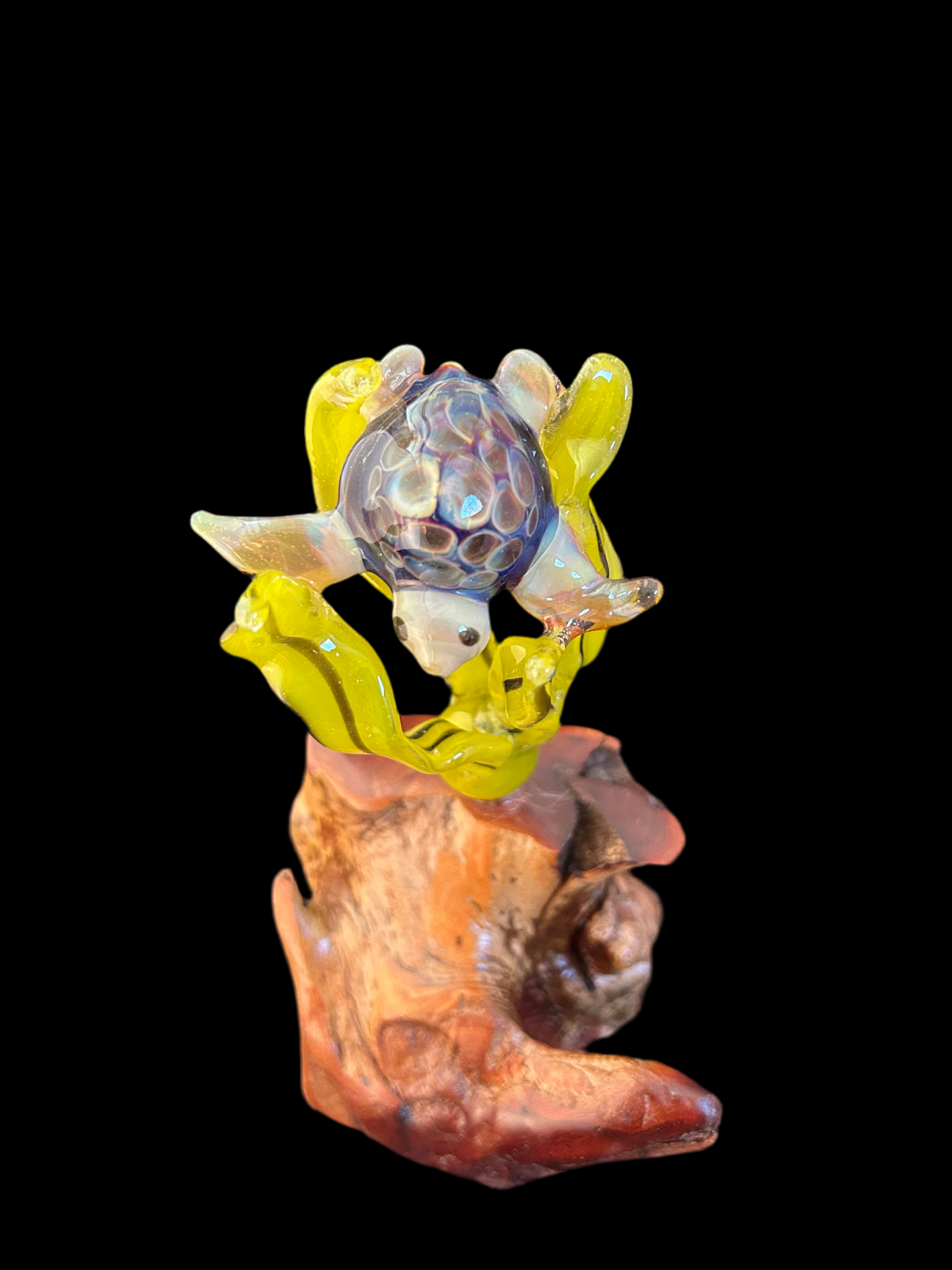 This exquisite Tan Turtle Sculpture is hand sculptured with borosilicate glass and features a honeycomb body and delicate seaweed mounted on a manzanita base. Elegantly crafted, it brings a touch of luxury to any space and is a stunning addition to any art or decor collection.